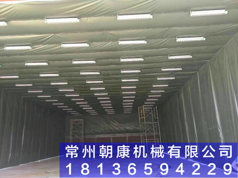 噴漆時(shí)送風(fēng)機(jī)、排風(fēng)機(jī)同時(shí)啟動(dòng)(若冬季需要提高操作環(huán)境的溫度,加熱系統(tǒng)也同時(shí)啟動(dòng)),室外新鮮空氣由進(jìn)風(fēng)口經(jīng)過進(jìn)風(fēng)過濾器進(jìn)入加熱送風(fēng)機(jī)組,再由送風(fēng)機(jī)將處理后的氣流送入到噴漆間頂部的靜壓室,靜壓室底部的過濾棉對(duì)氣流進(jìn)行均壓過濾后呈層流方式進(jìn)入到噴漆間內(nèi),在工件和操作工人周圍形成由上而下的微風(fēng)氣流,使噴漆時(shí)產(chǎn)生的剩余漆霧隨氣流而下,不會(huì)向四周彌散,以保護(hù)操作者勞動(dòng)安全。室內(nèi)空載平均風(fēng)速為0.3~0.5米/秒。在有序氣流的作用下,含漆霧空氣穿過輕型格柵進(jìn)入排風(fēng)地溝,大部分漆霧在繞過地溝格柵下面的折流板時(shí)因氣流突然折射的原因漆霧顆粒隨慣性作用而沉降在折流板上,剩余的細(xì)小漆霧顆粒隨氣流再次經(jīng)過折流板下面的漆霧過濾棉對(duì)剩余漆霧顆粒進(jìn)行過濾,凈化后的氣流通過防爆排風(fēng)機(jī)排向室外高空。漆霧凈化效率≥95%當(dāng)需要對(duì)工件進(jìn)行烘干時(shí),加熱送風(fēng)系統(tǒng)可設(shè)計(jì)成為循環(huán)加熱送風(fēng),不斷的對(duì)噴漆間內(nèi)的空氣及工件表面進(jìn)行循環(huán)加熱,保證噴漆間內(nèi)工件表面漆膜的烘干需要。 干式噴漆房+伸縮移動(dòng)式噴漆房