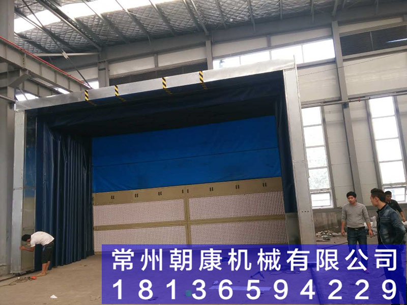 噴漆時送風機、排風機同時啟動(若冬季需要提高操作環(huán)境的溫度,加熱系統(tǒng)也同時啟動),室外新鮮空氣由進風口經(jīng)過進風過濾器進入加熱送風機組,再由送風機將處理后的氣流送入到噴漆間頂部的靜壓室,靜壓室底部的過濾棉對氣流進行均壓過濾后呈層流方式進入到噴漆間內(nèi),在工件和操作工人周圍形成由上而下的微風氣流,使噴漆時產(chǎn)生的剩余漆霧隨氣流而下,不會向四周彌散,以保護操作者勞動安全。室內(nèi)空載平均風速為0.3~0.5米/秒。在有序氣流的作用下,含漆霧空氣穿過輕型格柵進入排風地溝,大部分漆霧在繞過地溝格柵下面的折流板時因氣流突然折射的原因漆霧顆粒隨慣性作用而沉降在折流板上,剩余的細小漆霧顆粒隨氣流再次經(jīng)過折流板下面的漆霧過濾棉對剩余漆霧顆粒進行過濾,凈化后的氣流通過防爆排風機排向室外高空。漆霧凈化效率≥95%當需要對工件進行烘干時,加熱送風系統(tǒng)可設計成為循環(huán)加熱送風,不斷的對噴漆間內(nèi)的空氣及工件表面進行循環(huán)加熱,保證噴漆間內(nèi)工件表面漆膜的烘干需要。 干式噴漆房+伸縮移動式噴漆房